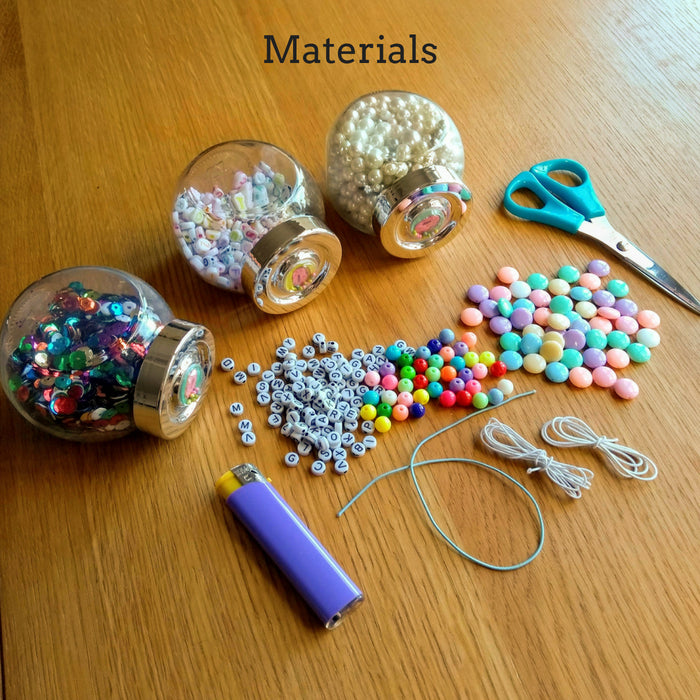 Grab all of your beads and find the letters you need for the name. Then you need to measure a piece of elastic to fit around your kid’s wrist and leave some extra for tying the ends together.