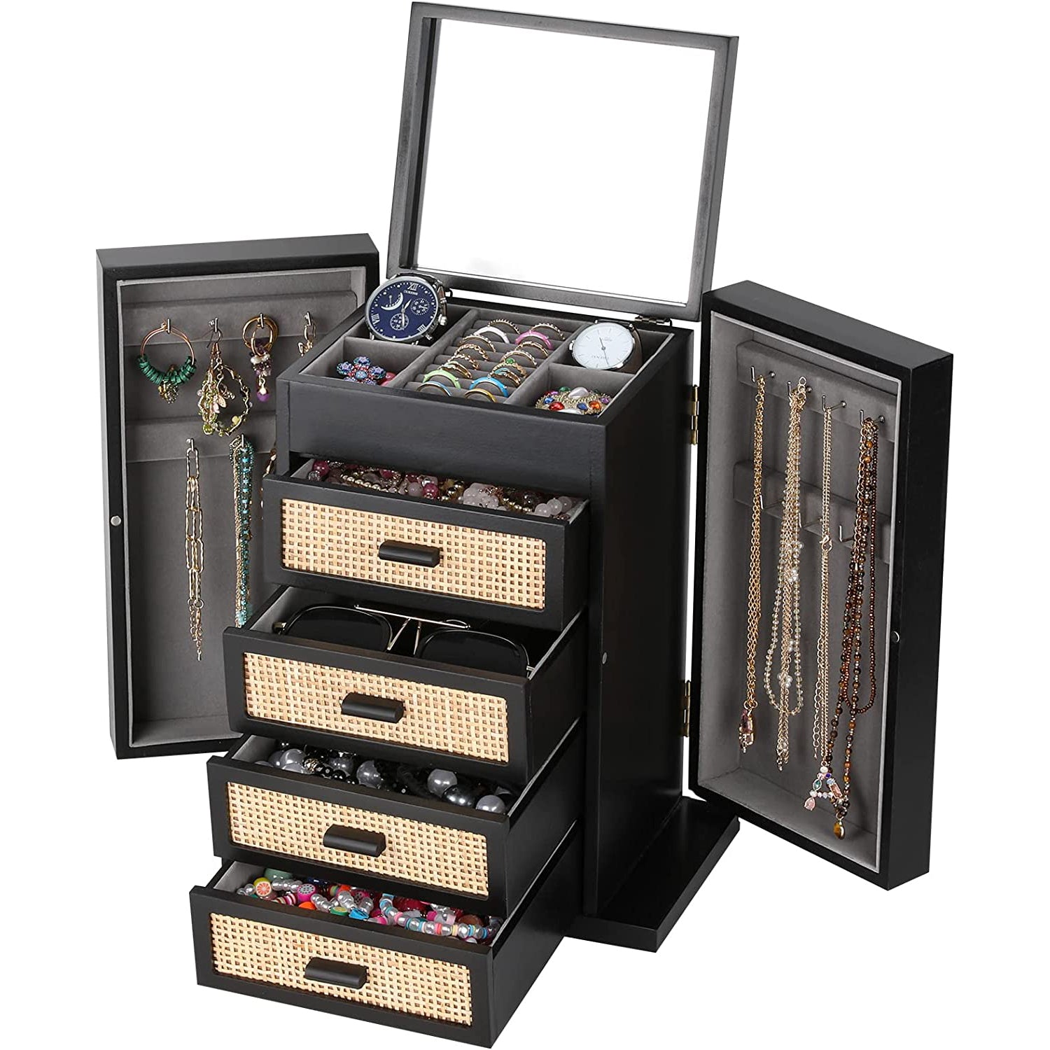 - 【Multifunction & Large Capacity】–5 layers with 4 drawers and 2 side doors offers you large space to tidy your dresser and organize all your jewelry accessories inside neatly, such as necklaces, rings, earrings, bracelets, cuff links, brooches, watches and other accessories. With large built-in mirror, makes it more convenient for you to dress yourself.