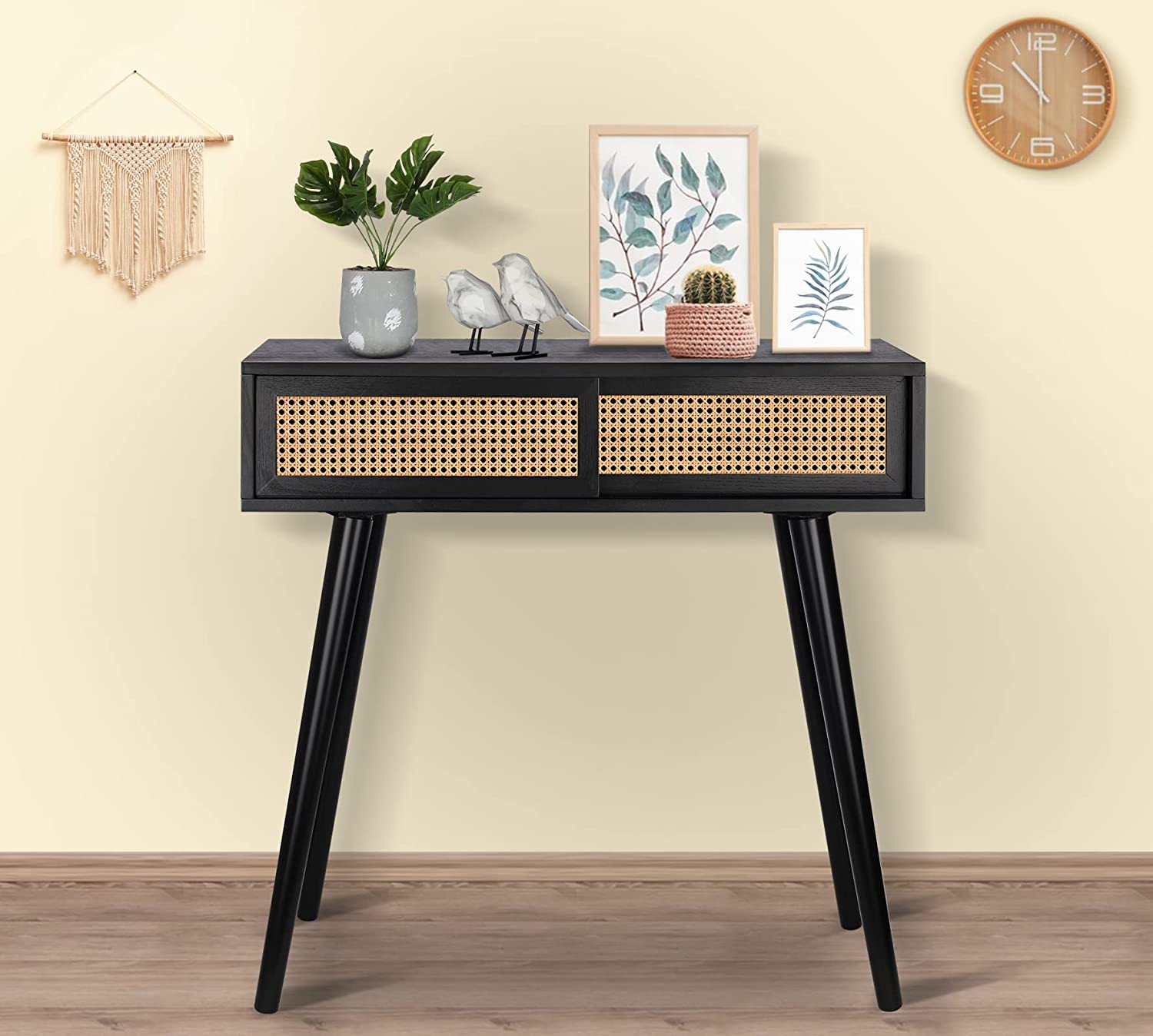 Console Table Black, 31" Console Tables for Entryway Small Entryway Table, Vanity Desk Rattan Dresser Side Table Entry Table Narrow Console Table Modern Hallway Table Boho Sofa Table for Living Room