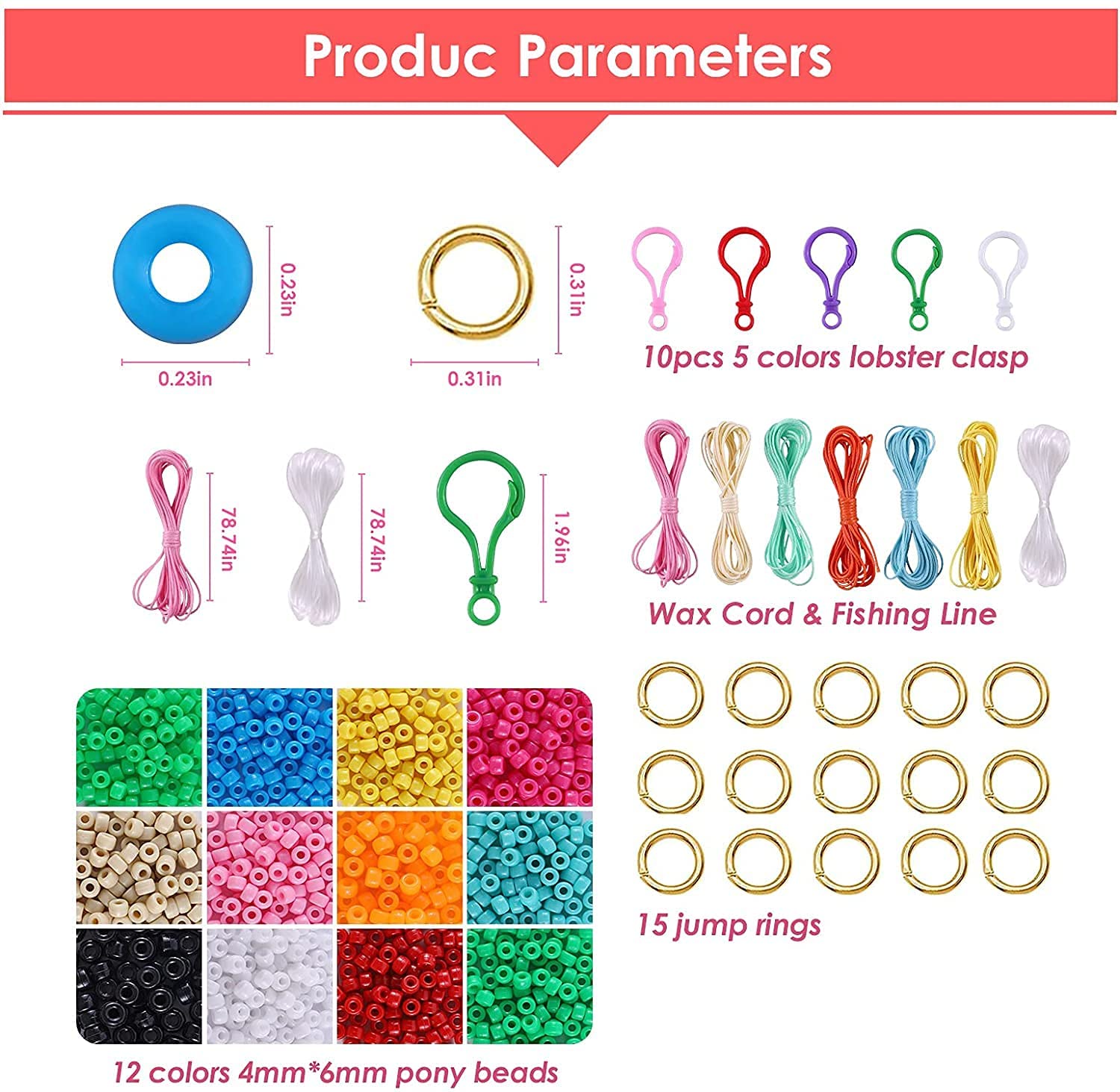 • Package includes: 1200pcs 4mm*6mm pony beads in 12 colors, 10pcs lobster clasp in 5 colors, 12m wax cord in 6 colors, 2m transparent fishing line, 15 jump rings, 1 Instruction, and 1 box.