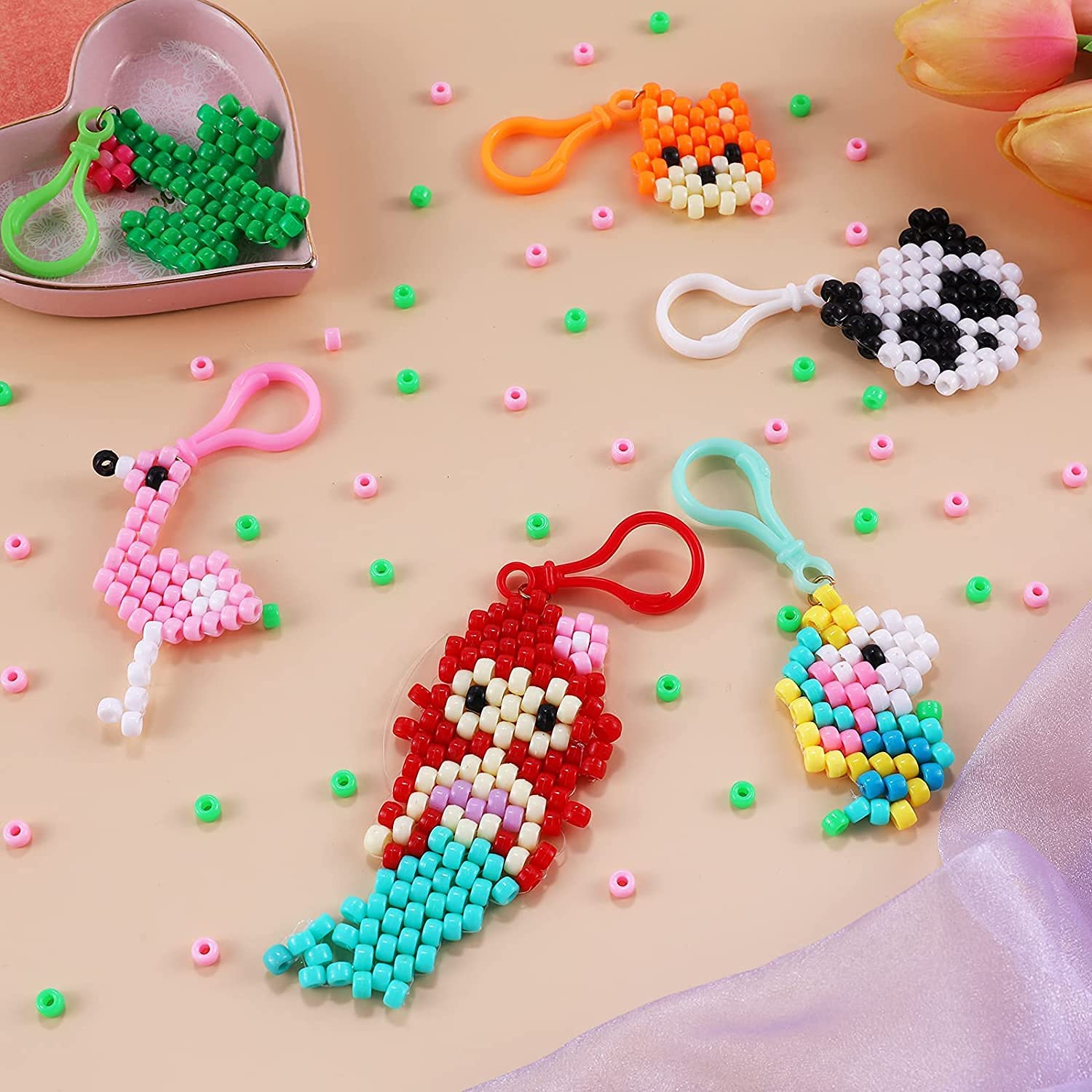 • How to Create Your Own keychains】: Our beads pet set includes a instruction with steps on how to make six keychain patterns, Mermaid, Panda, Flamingo, Cactus, Fox, Unicorn. This bead pets kit contains things you need to create 10+ pcs beading pets. Variety styles combination gives you multiple choices. Attach your bead pets to keyrings and lanyard clips to decorate your backpack, keys, school lanyards, and more.