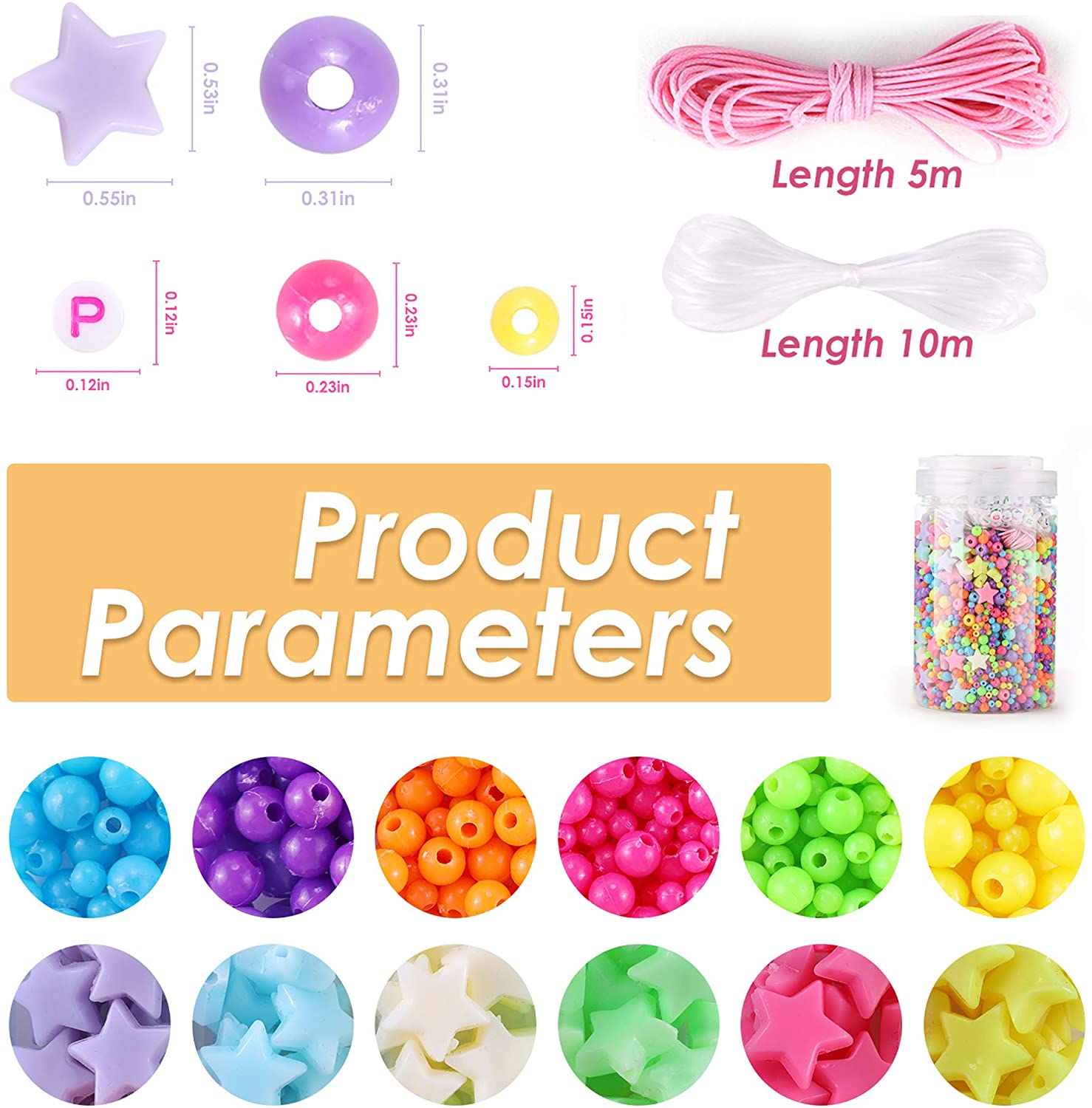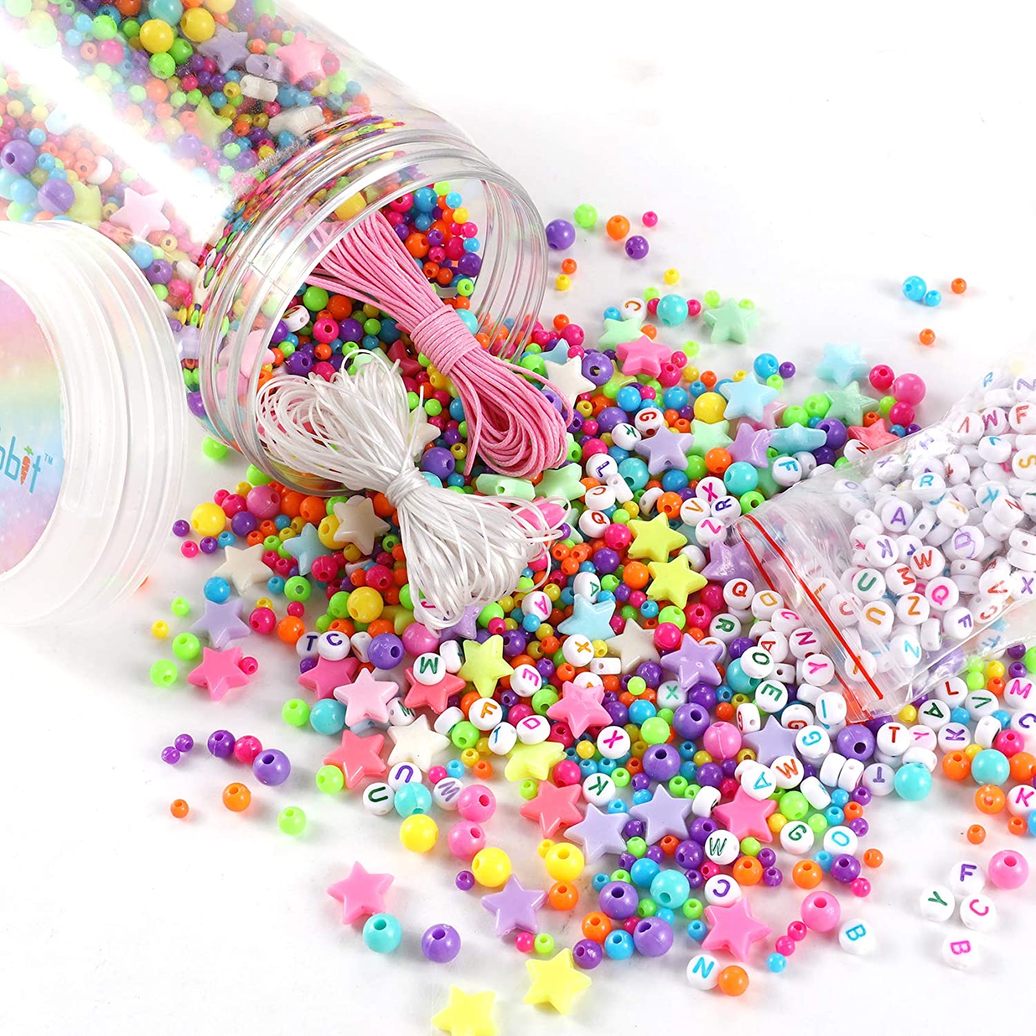 - Package includes: 4,100+ beads kit, including 3,600+ assorted rainbow round beads, 360+ alphabet beads, and 200+ star beads 10 M elastic cord, and 5 M pink wax cord. The beads conveniently come nestled inside a reusable bucket that is excellent for storing and organizing.