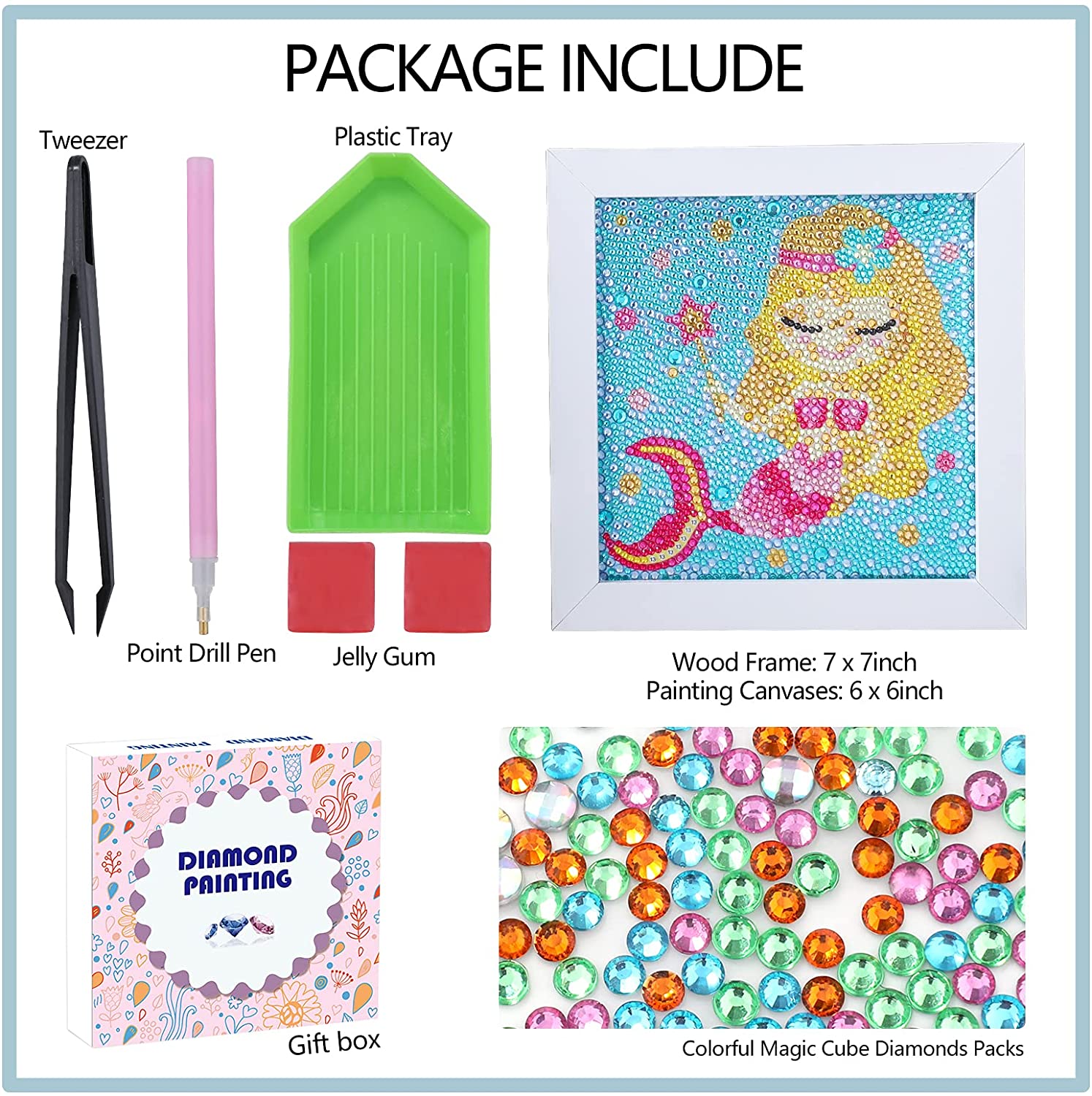 - Package includes: 1 x Wood Frame, 1 x Mermaid Painting Canvases, 1*Diamond Painting Stylus, 2*Wax Square, 1*Gem tray, 1*Tweezer